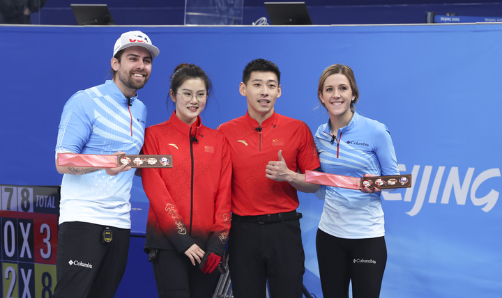 2月5日,中国队选手范苏圆(左二)、凌智(左三)与美国队选手克里斯托弗·普利斯(左一)、维多利亚·珀辛格在赛后合影。新华社记者王婧嫱摄