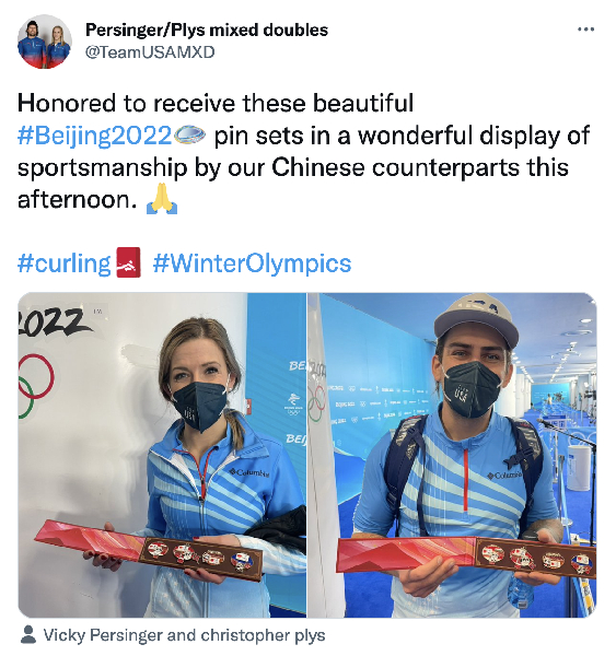“冬奥朋友圈”展现出了中国选手与其他国家运动员惺惺相惜的珍贵友情。在冰壶混双循环赛第八轮比赛中,中国冰壶混双组合凌智和范苏圆不敌美国组合维多利亚·珀辛格和克里斯托弗·普利斯。赛后,凌智和范苏圆向对方赠送“冰墩墩”奥运纪念徽章,美国选手惊喜地接过礼物,四人合影留念。美国选手随后在社交媒体账户上晒出收获礼物的照片,并写道:“非常荣幸收到这些精美的北京冬奥会徽章,我们的中国同行精彩地展现了体育精神。”美国队员赛后在更衣室也向凌智和范苏圆回赠了徽章。