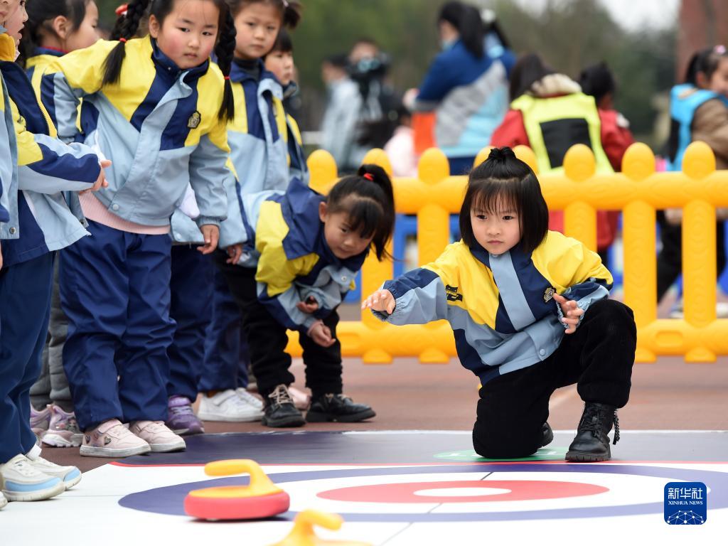 2月16日,合肥市泰山路幼儿园的小朋友在开学典礼上体验“旱地冰壶”游戏。