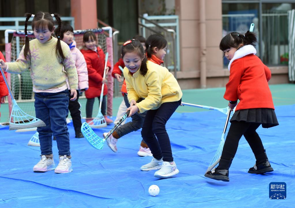 2月16日,合肥市泰山路幼儿园的小朋友在开学典礼上体验“旱地冰球”游戏。