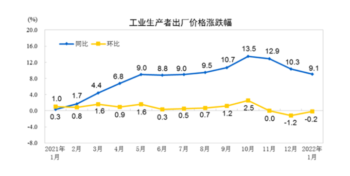 此外,工业品价格整体继续回落。1月份,全国工业生产者出厂价格指数(PPI)同比上涨9.1%,涨幅比上月回落1.2个百分点,其中煤炭开采和洗选业、石油和天然气开采业价格同比涨幅回落较大,分别回落15.5和7.4个百分点。