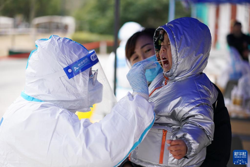 2月16日,在苏州工业园区星湾社区群星苑小区,医务人员在对小朋友进行核酸采样。新华社记者 季春鹏 摄