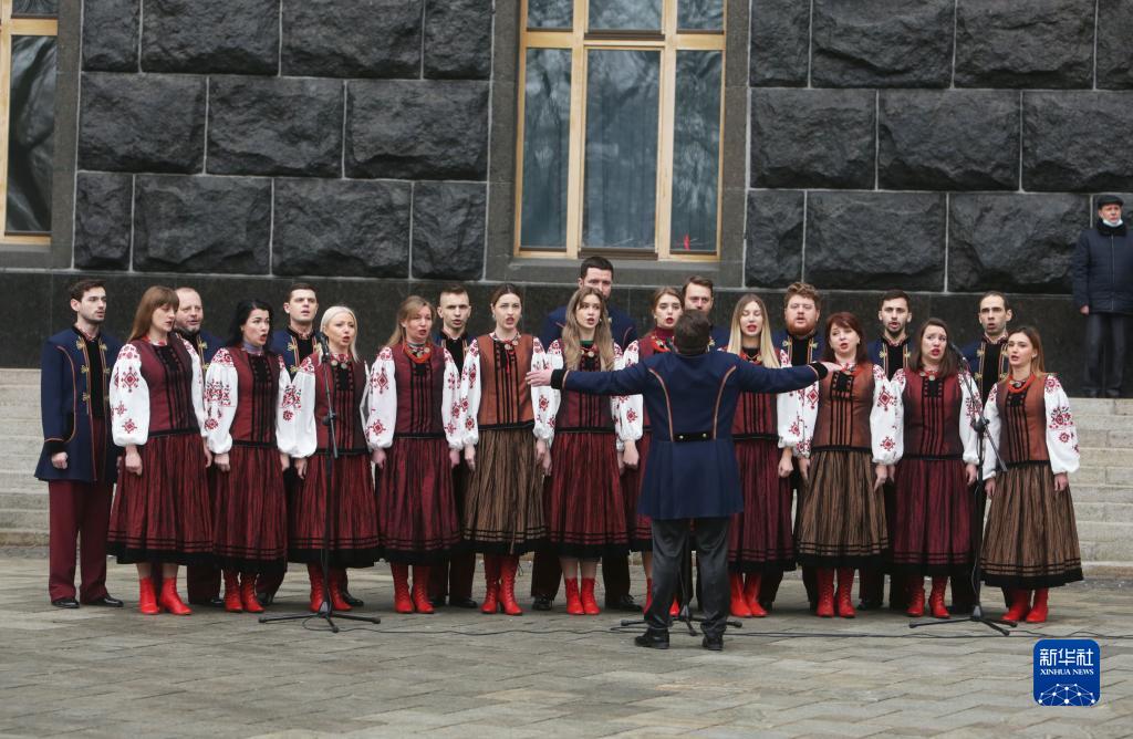 2月16日,在乌克兰首都基辅,身着乌克兰传统服饰的合唱团演员唱国歌。