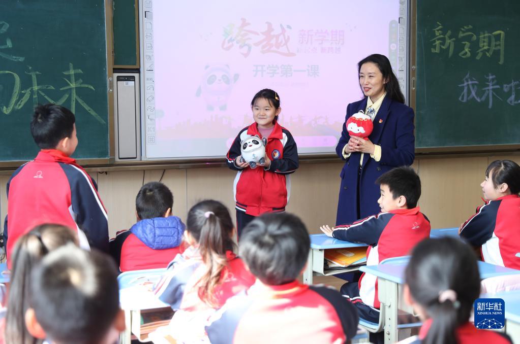 2月16日,在山东青岛中德生态园小学,老师和学生在开学第一课上交流冬奥健儿的故事。
