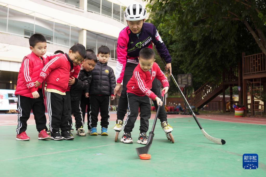 2月16日,在重庆市北碚区缙云幼儿园,孩子们在开学第一课上体验旱地冰球。
