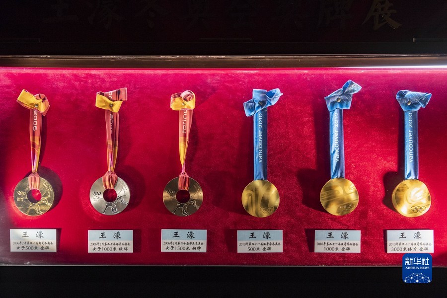 这是1月8日在七台河短道速滑冠军馆内拍摄的王濛在2006年都灵冬奥会和2010年温哥华冬奥会上获得的六枚奖牌,包括四枚金牌、一枚银牌和一枚铜牌。新华社记者 谢剑飞 摄
