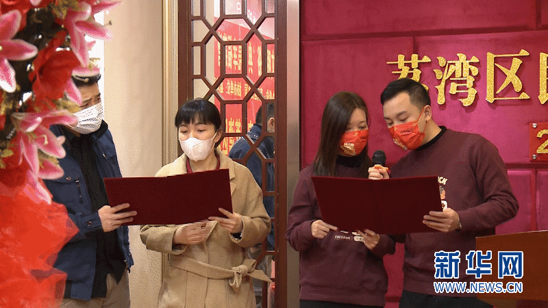 2月15日,广州市荔湾区开展“文明婚俗‘典’亮幸福荔湾”之线上观礼暨金婚银婚故事集发布活动。四对新人在亲朋好友的“线上见证”下喜结连理。