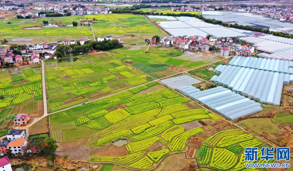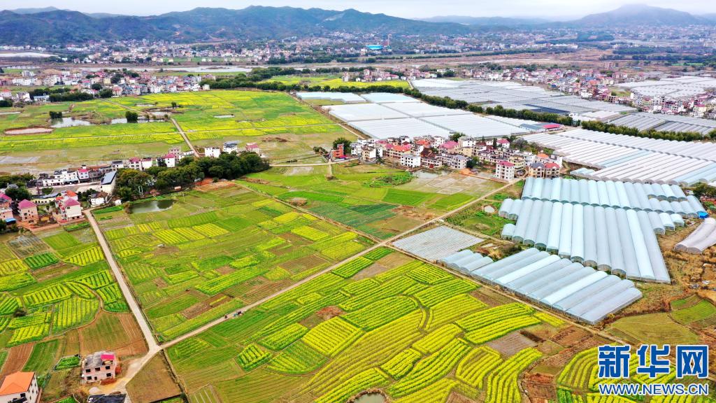 黄绿相间的田园、连片的蔬菜大棚和错落有致的民房相映成趣,构成了一幅美丽的乡村春景图。新华网发 陈鹏 摄