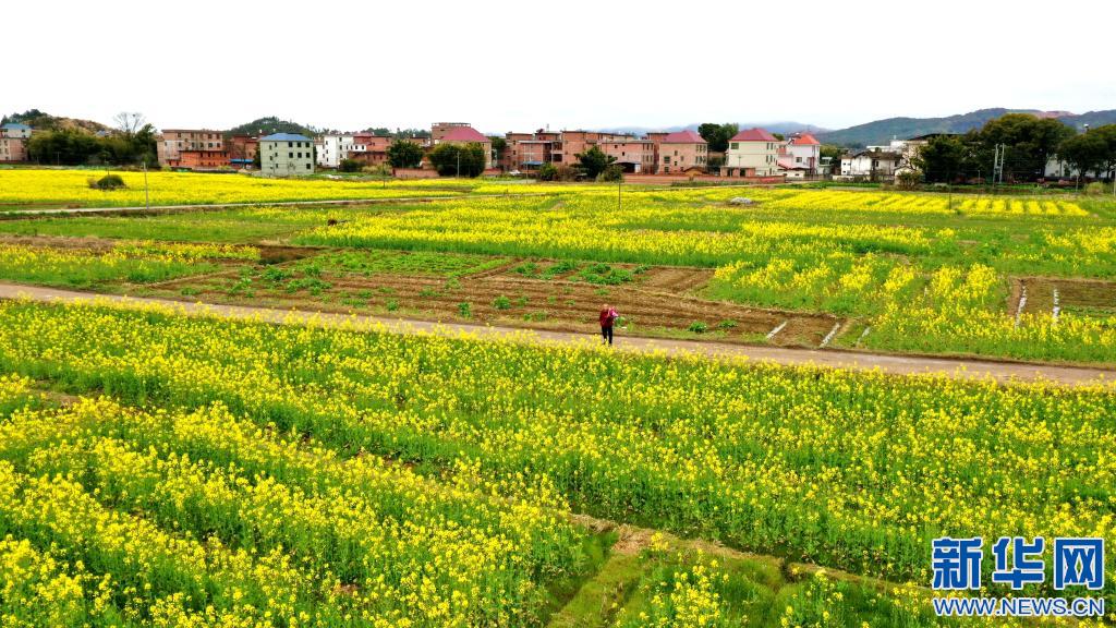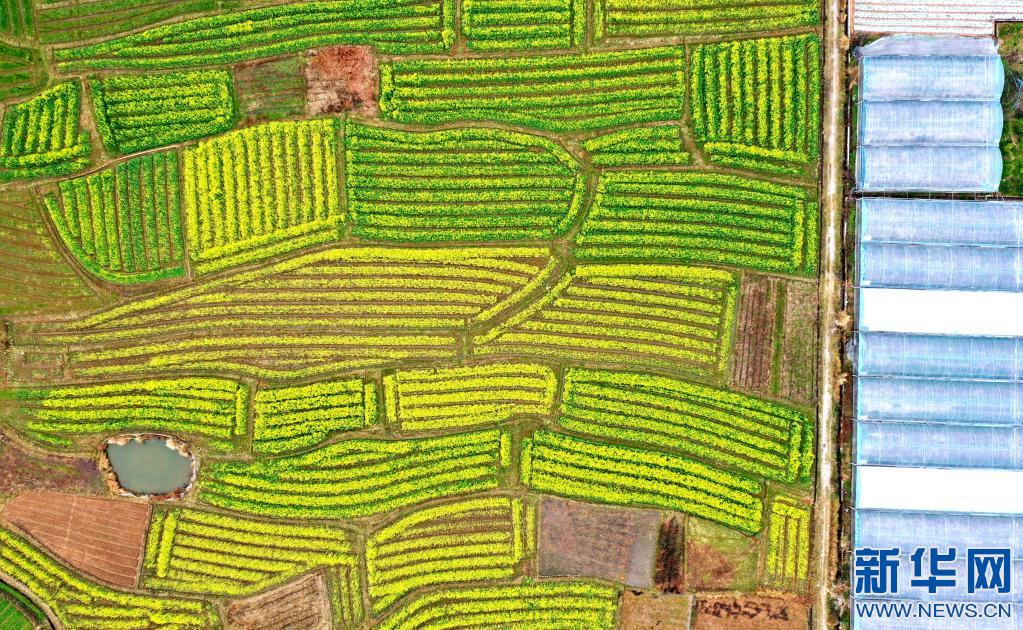 初春时节,在江西省赣州市兴国县埠头乡垓上村,田间金灿灿的油菜花陆续绽放,美不胜收。黄绿相间的田园、连片的蔬菜大棚和错落有致的民房相映成趣,构成了一幅美丽的乡村春景图。近年来,兴国县因地制宜,发展油菜种植和乡村旅游观光,把美丽田园转化为美丽经济,实现生态和经济双丰收。 (胡建强 通讯员陈鹏)