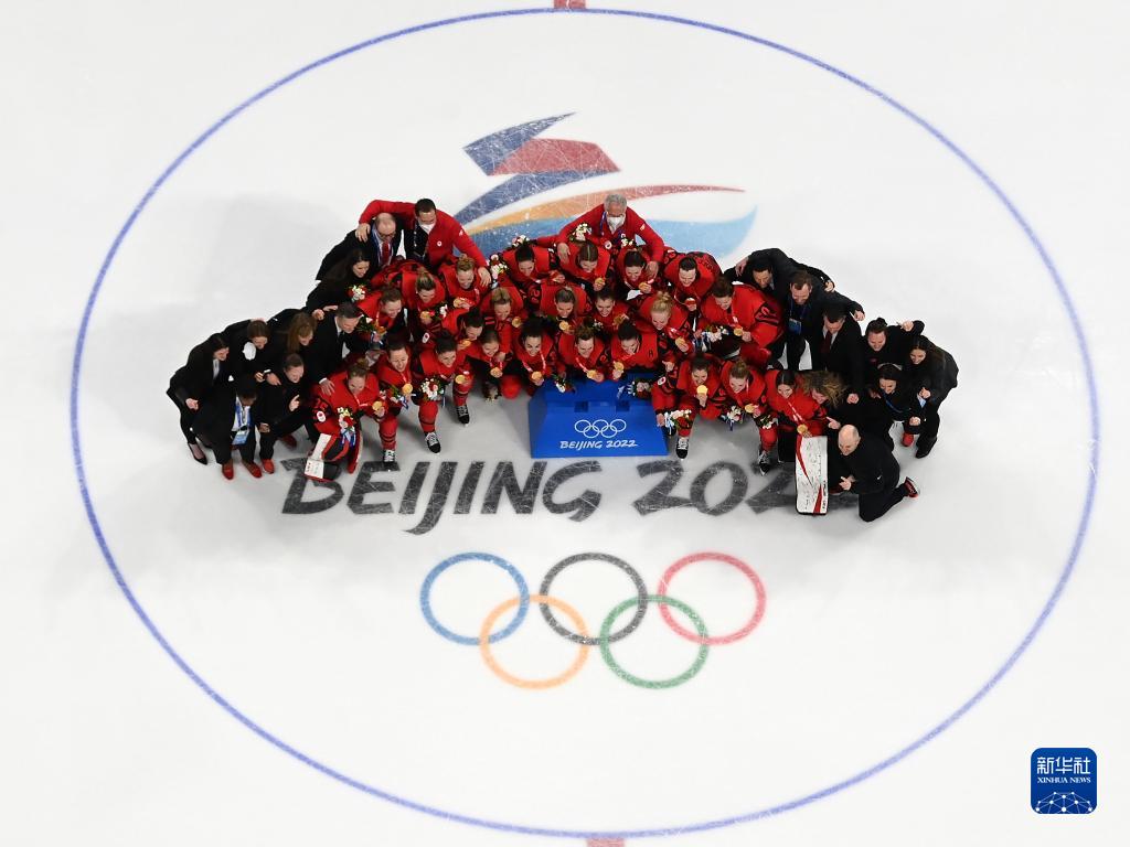 2月17日,北京冬奥会女子冰球金牌赛,加拿大队在夺冠后庆祝。新华社记者徐子鉴摄