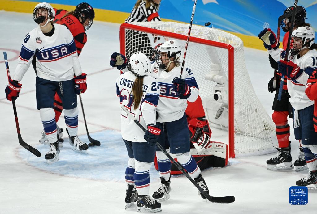 2月17日,美国队球员在北京冬奥会女子冰球金牌赛最后时刻攻入一球。新华社记者李然摄