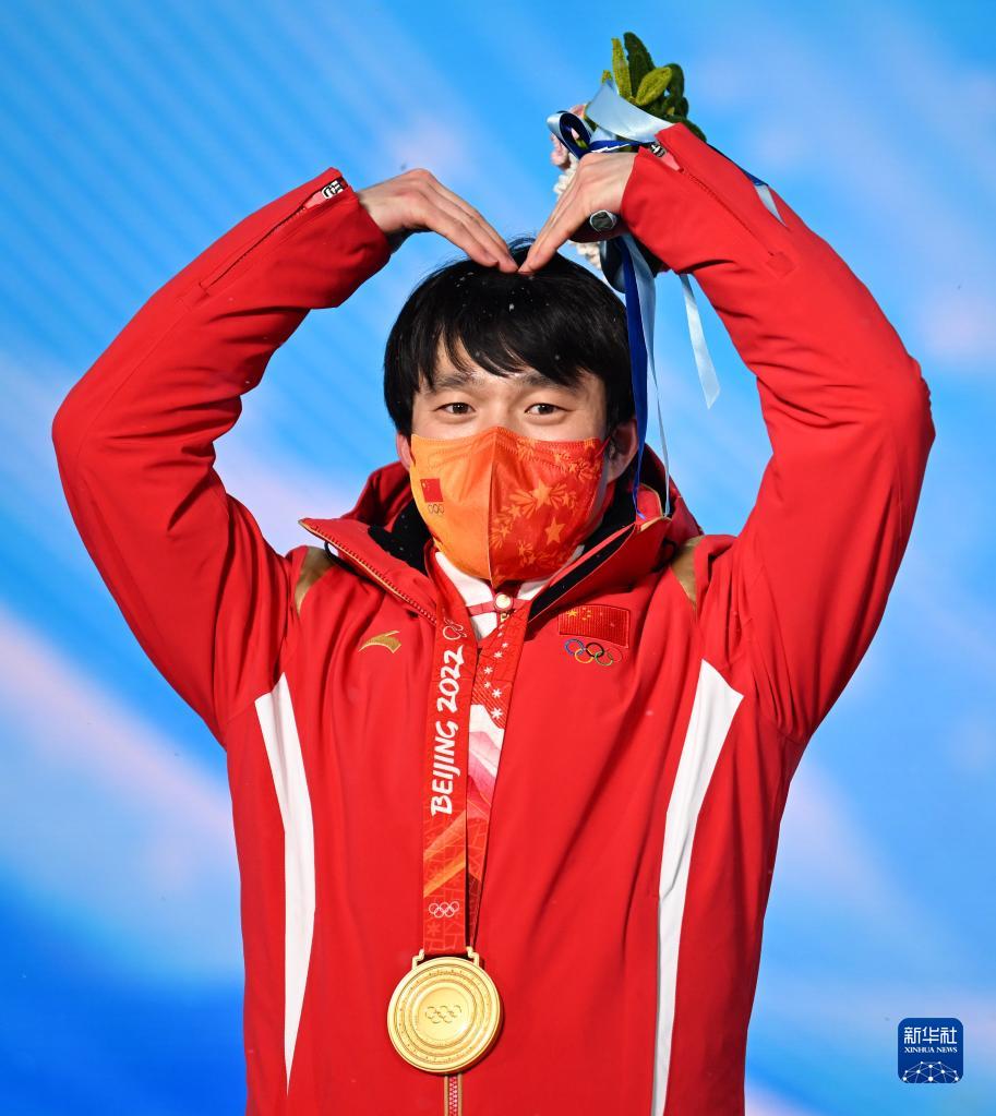 2月17日,冠军中国选手齐广璞在奖牌颁发仪式上。