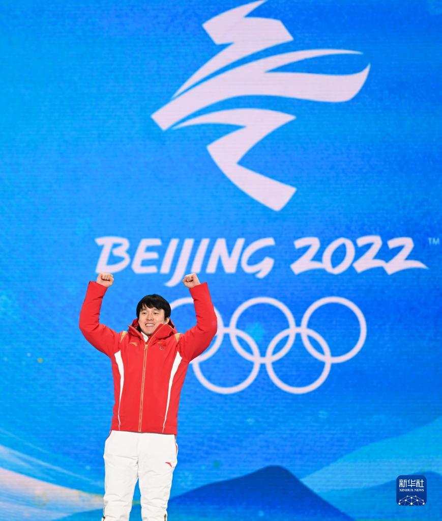 2月17日,冠军中国选手齐广璞在奖牌颁发仪式上。