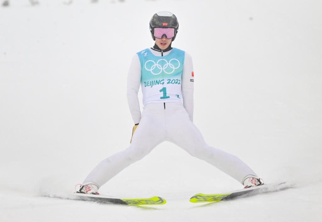 2月17日,中国队选手赵嘉文在北京2022年冬奥会北欧两项团体赛跳台滑雪比赛中。新华社记者朱峥摄