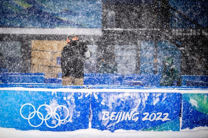 2月9日,在国家高山滑雪中心,陈益宸在比赛开始前查看拍摄点位。