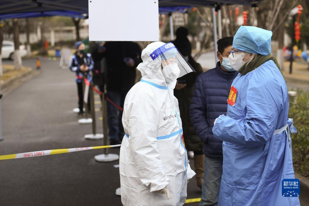 2月18日,在苏州工业园区西湖社区青湖丽苑小区核酸采样点,志愿者施爱伦(前右)与王君在交流工作。