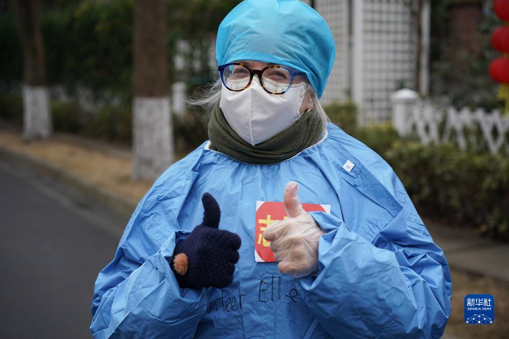 2月18日,在苏州工业园区西湖社区青湖丽苑小区核酸采样点,志愿者施爱伦在为苏州加油。
