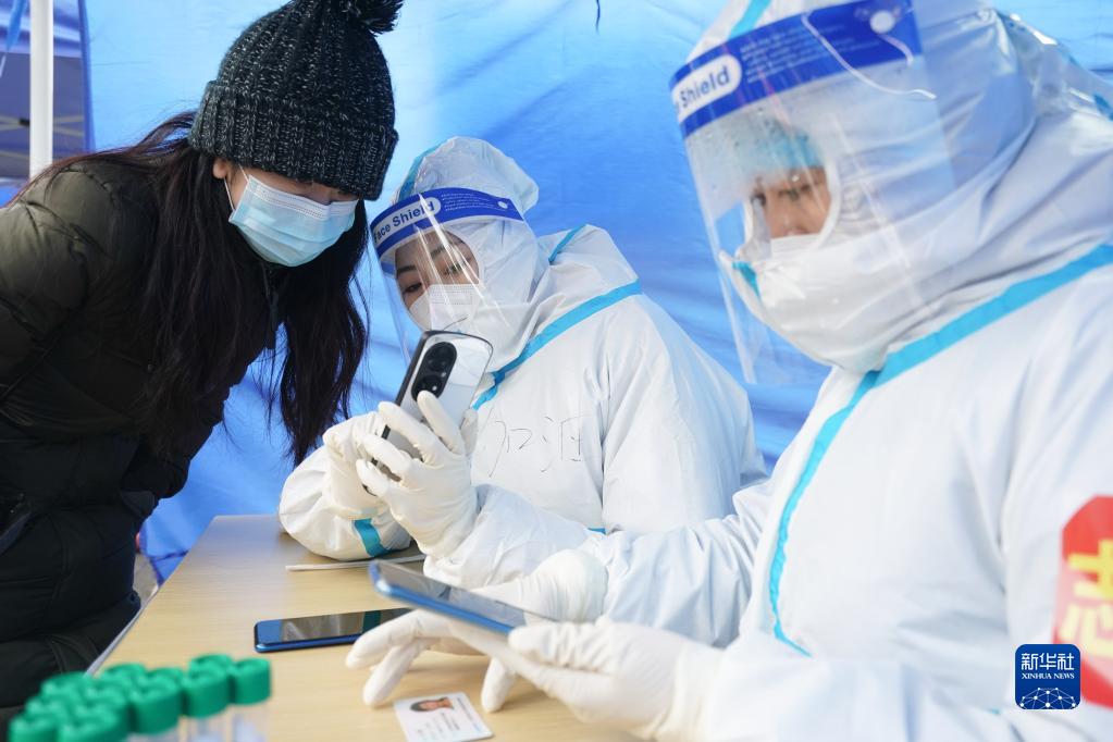 2月18日,在苏州工业园区西湖社区青湖丽苑小区核酸采样点,志愿者吴琼(右)、高洁(中)在进行信息登记工作。