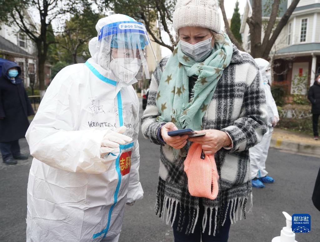 2月18日,在苏州工业园区西湖社区青湖丽苑小区核酸采样点,志愿者王君(左)协助外籍人士进行核酸检测。