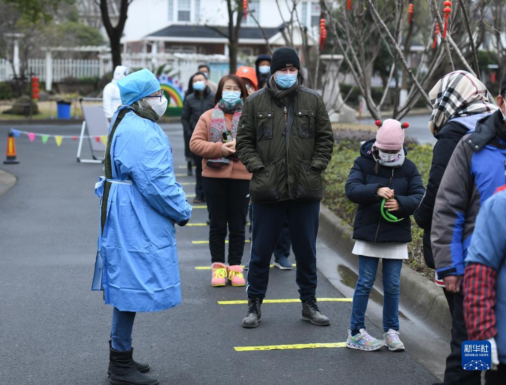 2月18日,志愿者施爱伦(左一)在苏州工业园区西湖社区青湖丽苑小区核酸采样点维持秩序。