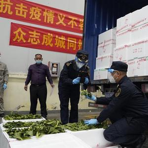 2月18日,番禺海关关员在检查供港蔬菜。新华社发