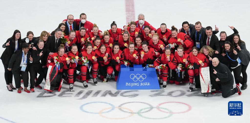 当日,在五棵松体育中心举行的北京2022年冬奥会女子冰球金牌赛中,加拿大队以3比2战胜美国队,获得冠军。