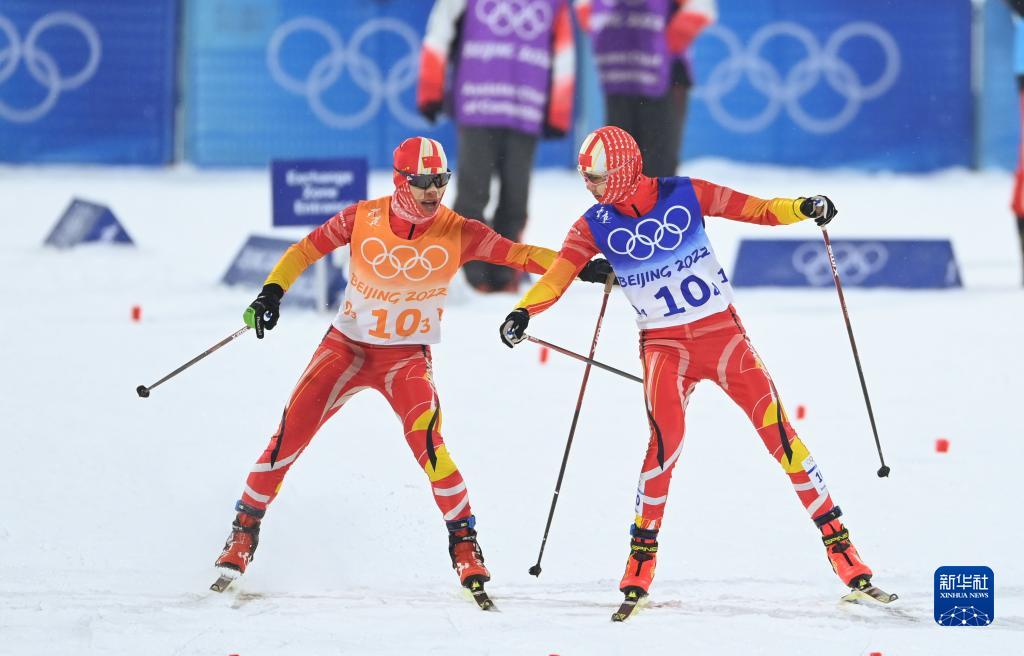 2月17日,中国队选手赵子贺(左)与队友范海斌在越野滑雪4×5公里接力比赛中交接。新华社记者戴天放摄