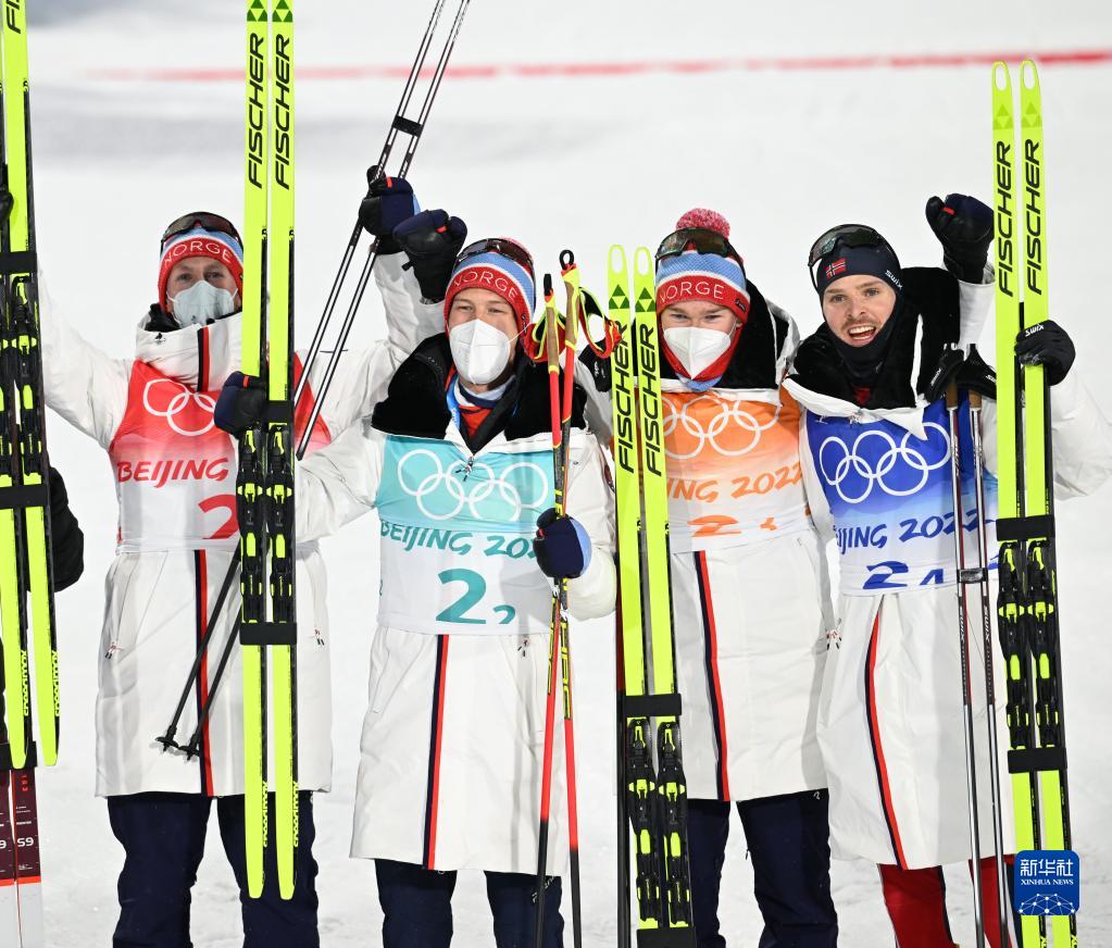 2月17日,冠军挪威队选手在越野滑雪4×5公里接力比赛后庆祝。新华社记者戴天放摄