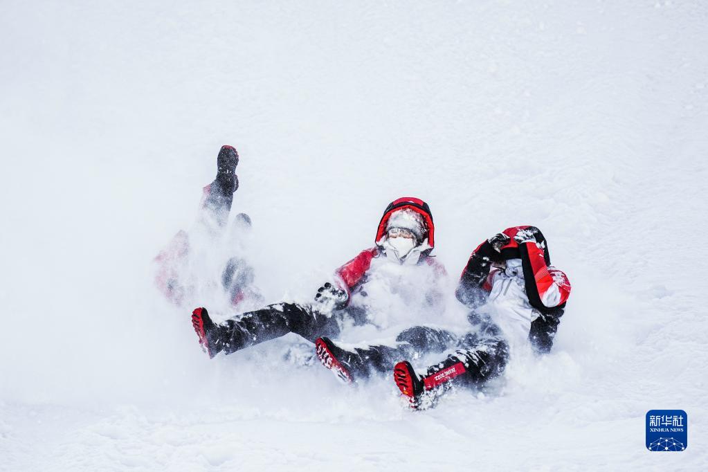 2月18日,场地工作人员在比赛结束后“放飞”自我,组队滑下陡坡。