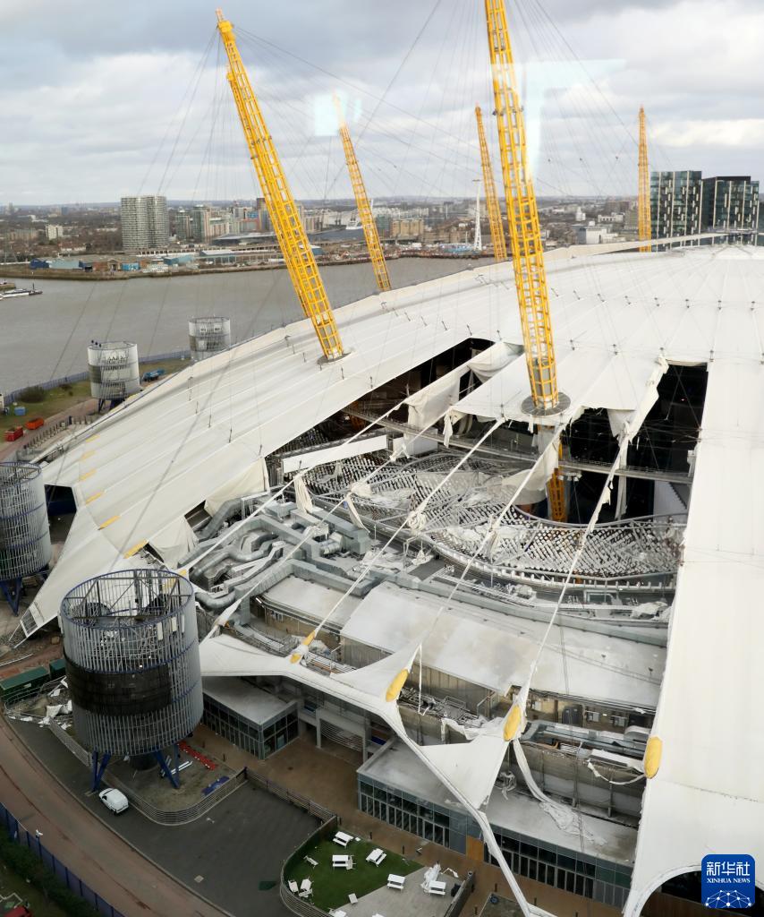 2月18日,英国伦敦O2体育馆顶部织物被狂风撕开,致使体育馆部分内部结构外露。