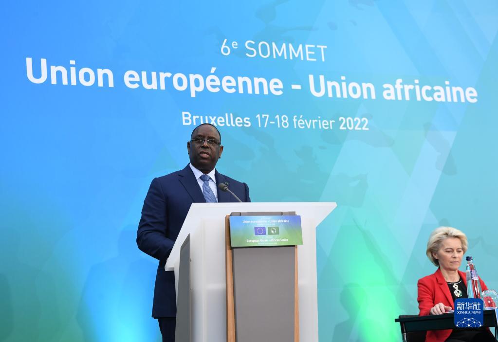2月17日,在比利时布鲁塞尔,非盟轮值主席、塞内加尔总统萨勒在峰会开幕式现场发言。新华社发(欧盟供图)