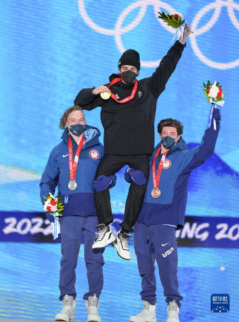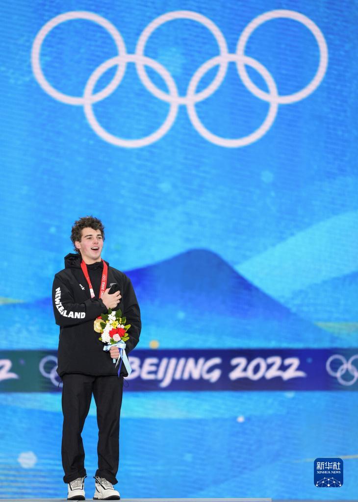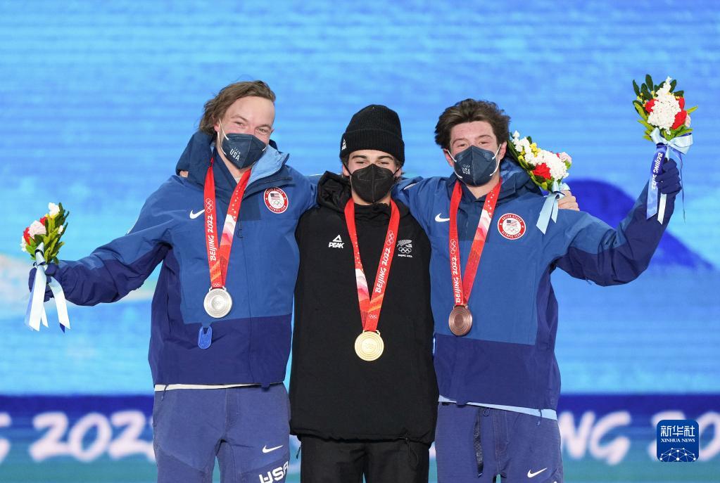 当日,北京2022年冬奥会自由式滑雪男子U型场地技巧奖牌颁发仪式在张家口赛区颁奖广场举行。