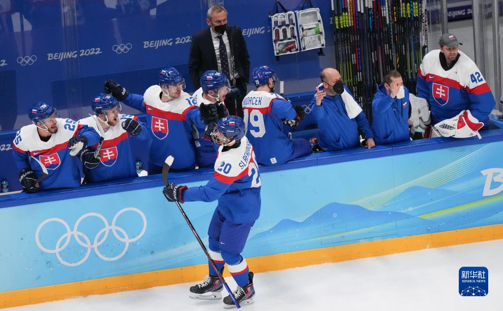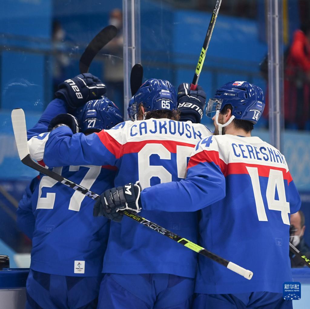 2月19日,斯洛伐克队球员庆祝进球。