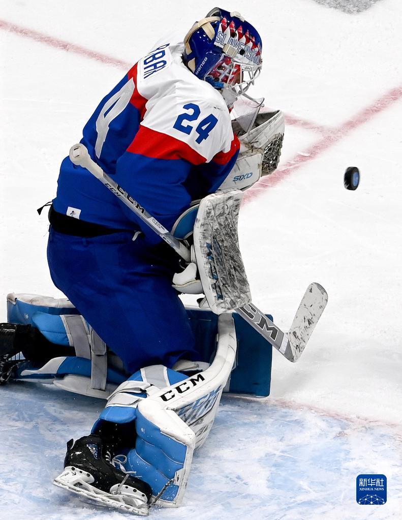 2月19日,斯洛伐克队守门员帕特里克·里巴尔在比赛中防守。