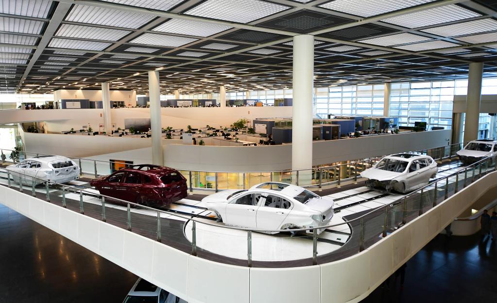 走进华晨宝马铁西工厂的主办公楼,迎面看见的就是一条悬空的流动生产线,车型颜色各异的新车一辆接一辆,准备进入总装车间完成车辆装配,每55秒左右就有一辆新车下线。