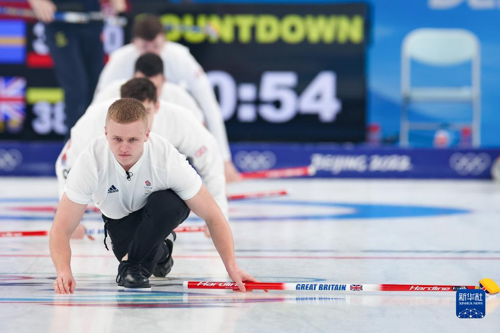当日,在北京国家游泳中心“冰立方”举行的北京2022年冬奥会男子金牌赛中,英国队对阵瑞典队。