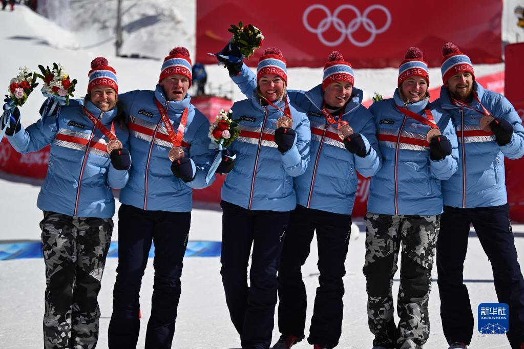 2月20日,季军挪威队在奖牌颁发仪式上。