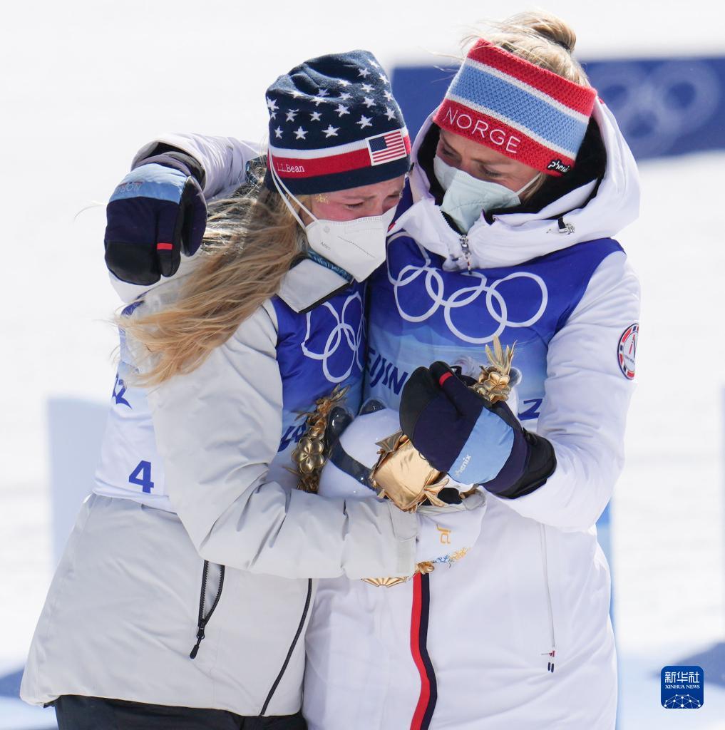 2月20日,获得冠军的挪威选手特蕾丝·约海于格(右)和获得亚军的美国选手杰茜·迪金斯在比赛后。