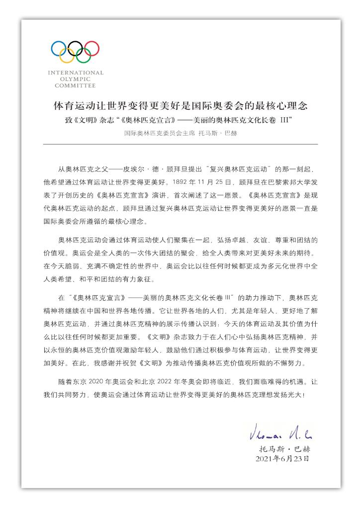 国际奥委会终身名誉主席萨马兰奇对此表示赞赏,他当时致信说:“《文明》杂志不仅用英文和法文,还首次用中文刊登《奥林匹克宣言》文稿,以此来提醒我们奥林匹克运动会的真正含义,并在中国和全世界人民当中传播奥林匹克的理想和价值观,即友谊、和平和普适性,我对此创意表示赞赏。”