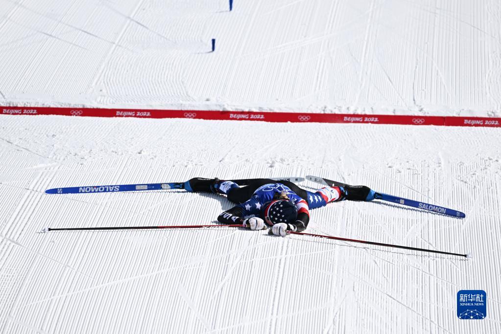 2月20日,获得亚军的美国选手杰茜·迪金斯在比赛中冲线后。