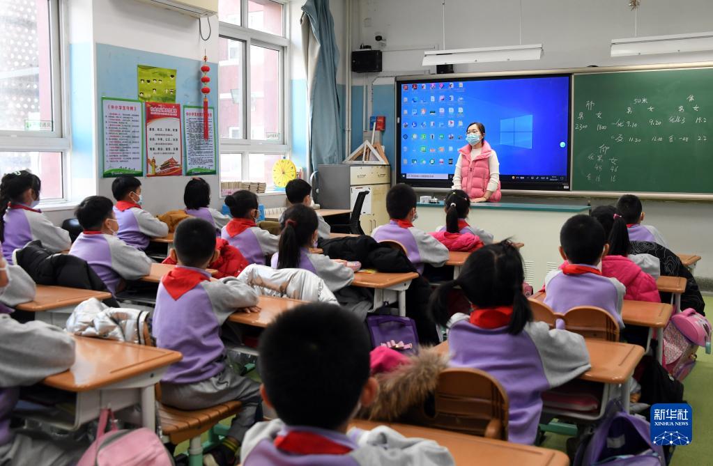 2月21日,在北京市海淀区双榆树第一小学,二年级(2)班的学生在上数学课。