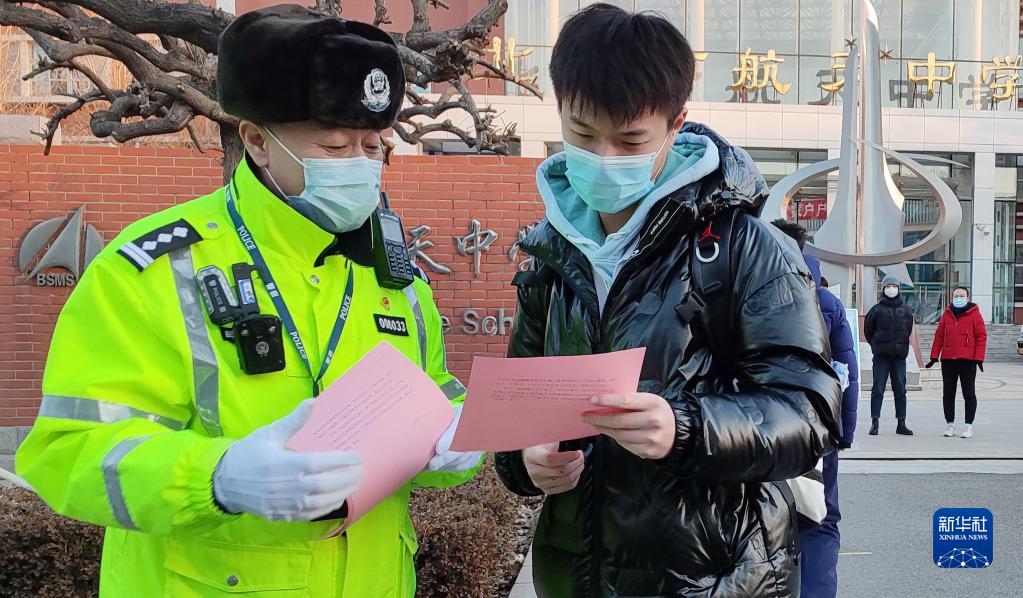 2月21日,交警在北京市丰台区航天中学校门口进行交通安全宣传。