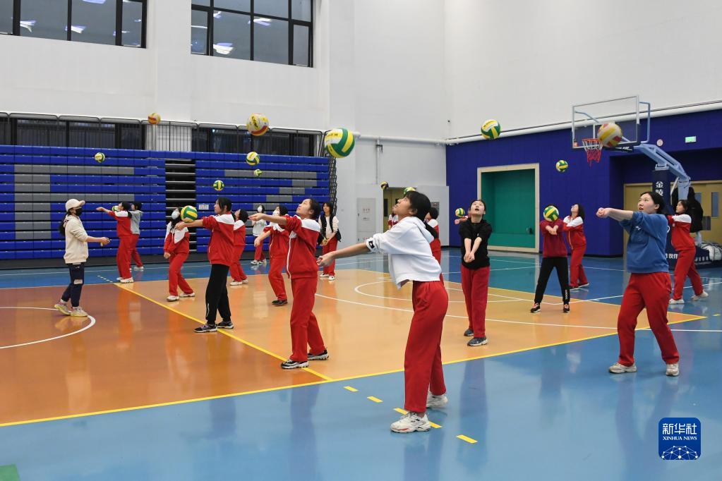 2月21日,在北京大学附属中学,初三年级学生在体育课上进行排球训练。