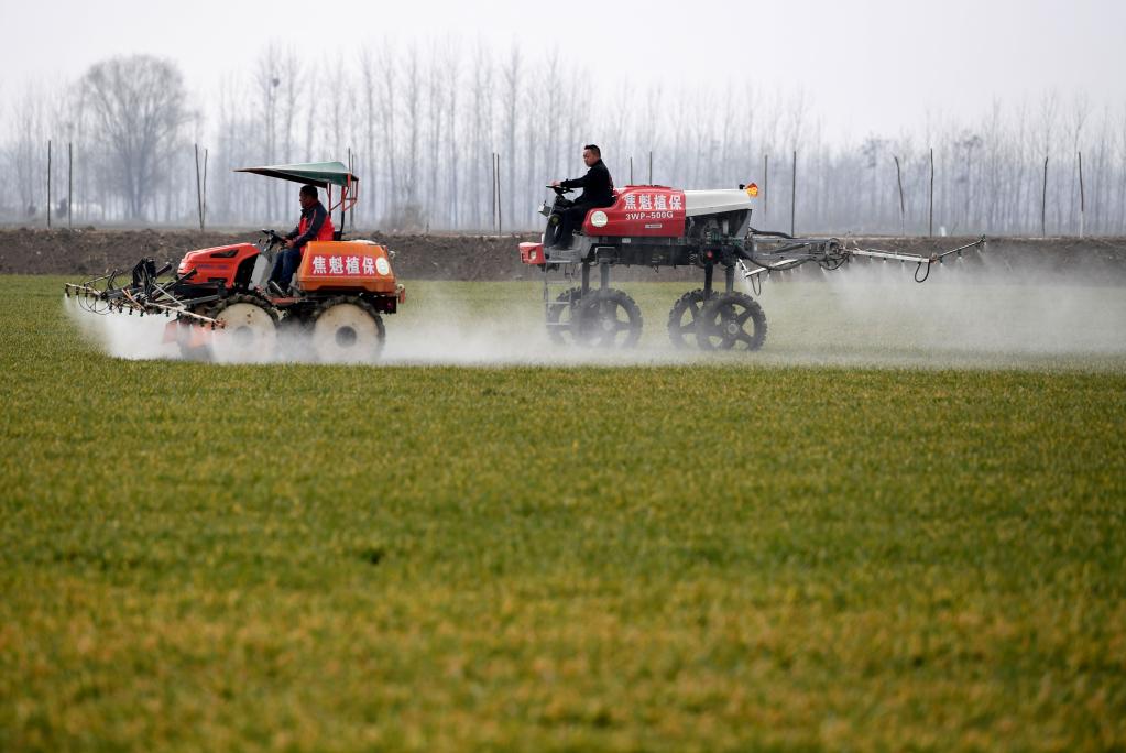 2月11日,安徽省亳州市谯城区赵桥乡双楼村村民在麦田里喷洒除草剂。 新华社记者刘军喜 摄