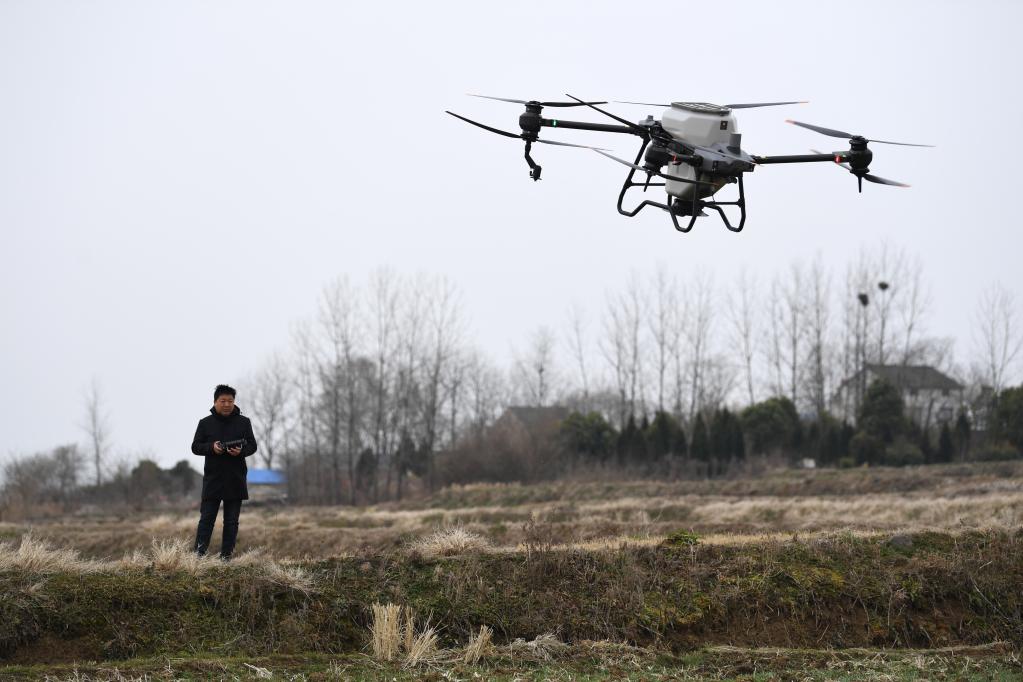 2月17日,安徽省滁州市来安县“农机达人”贾兴柱操作无人机,在麦田里施肥。 新华社记者刘军喜 摄