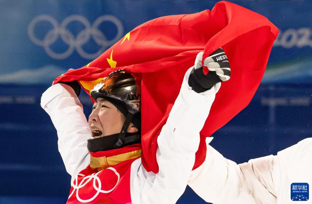 2月14日,中国选手徐梦桃在比赛后庆祝。当日,北京2022年冬奥会自由式滑雪女子空中技巧决赛在张家口云顶滑雪公园举行,中国选手徐梦桃夺得冠军。新华社记者 肖艺九 摄