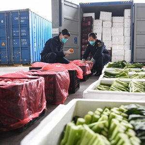 2月21日,在深圳大铲湾码头,深圳海关工作人员查验供港蔬菜。新华社记者 梁旭 摄