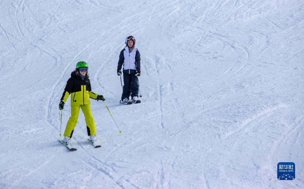 2月18日,在意大利科尔蒂纳丹佩佐,孩子们在高山滑雪场练习。