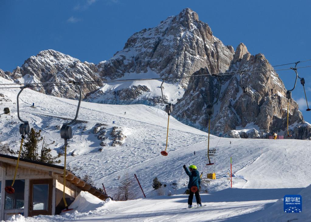 2月17日,在意大利科尔蒂纳丹佩佐,冰雪运动爱好者们在高山滑雪场练习。