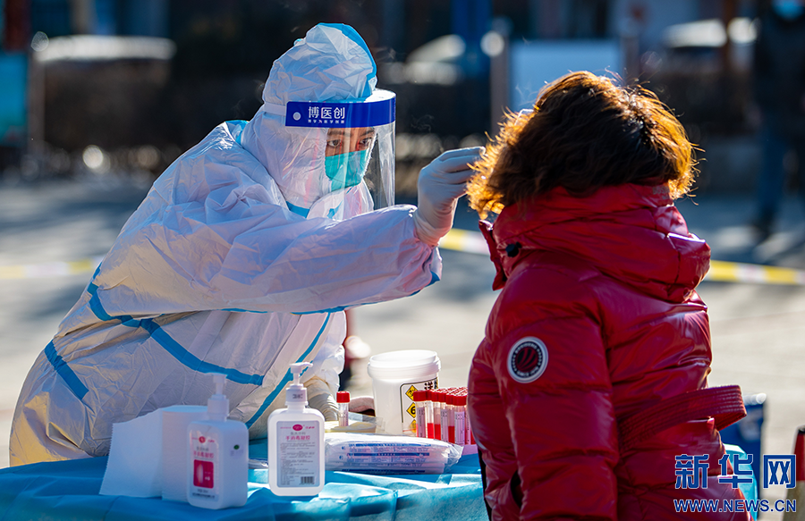 2月22日,在呼和浩特市玉泉区小召街道五塔寺广场临时核酸采样点,医护人员为市民进行核酸采样。新华网发(丁根厚 摄)